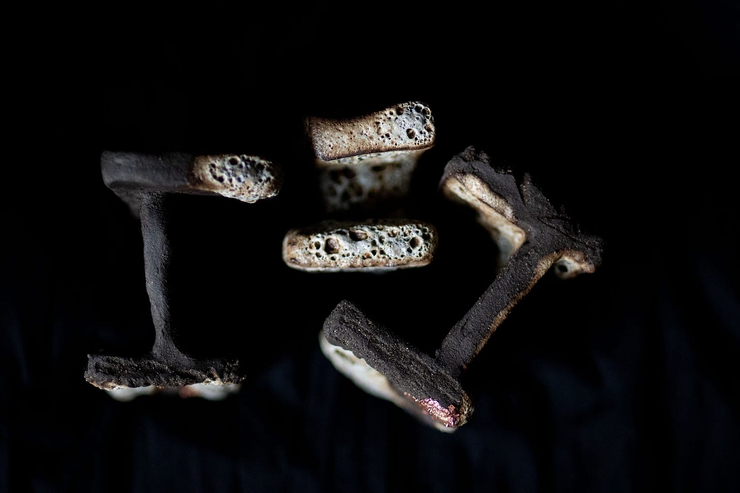 The lava glaze represents another process of transformation these pieces have gone through as they rested underground. I imagined something growing on them and taking over. Not moss or mold, but lava and metal, insinuating themselves in crevices and structures, forming new layers.